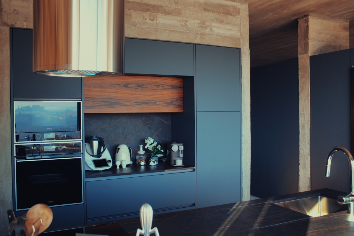 Gray lacquered mdf with elements in ebony veneer and tops in Dekton Laurent.