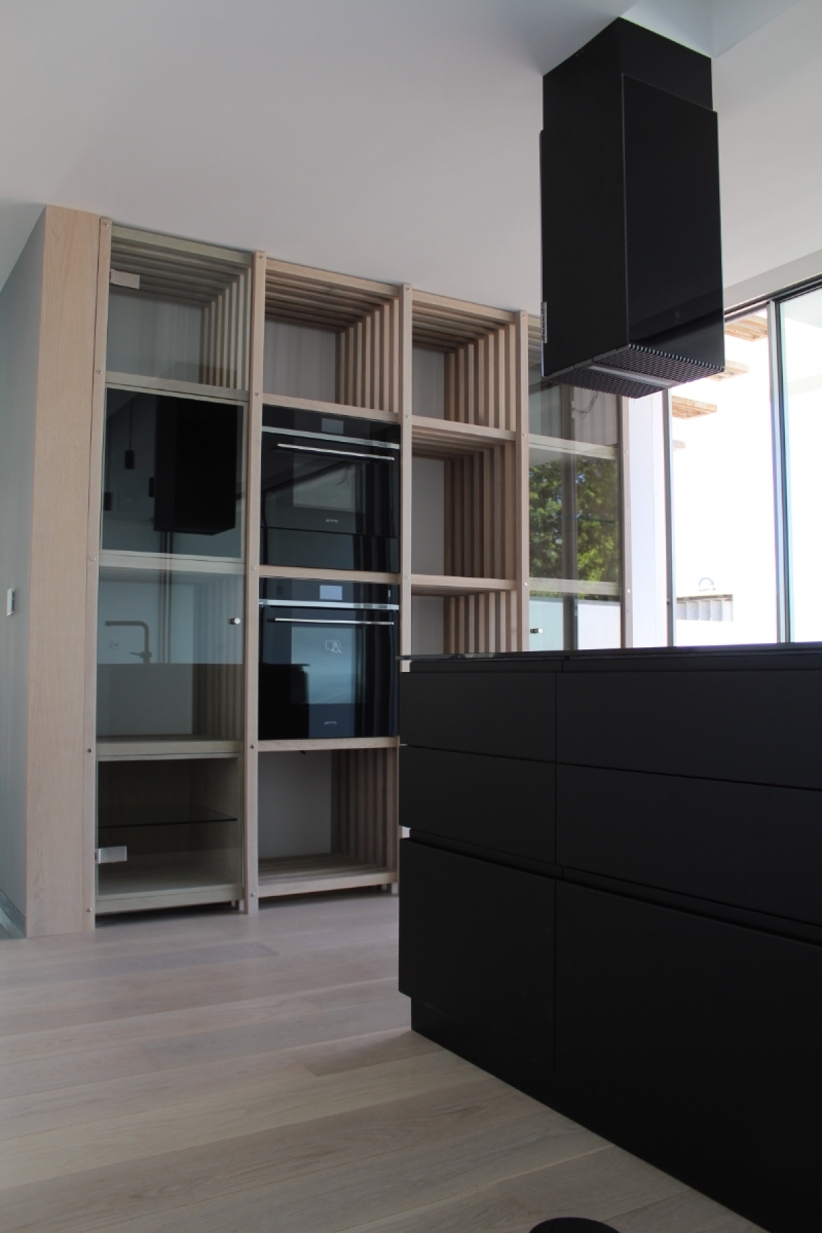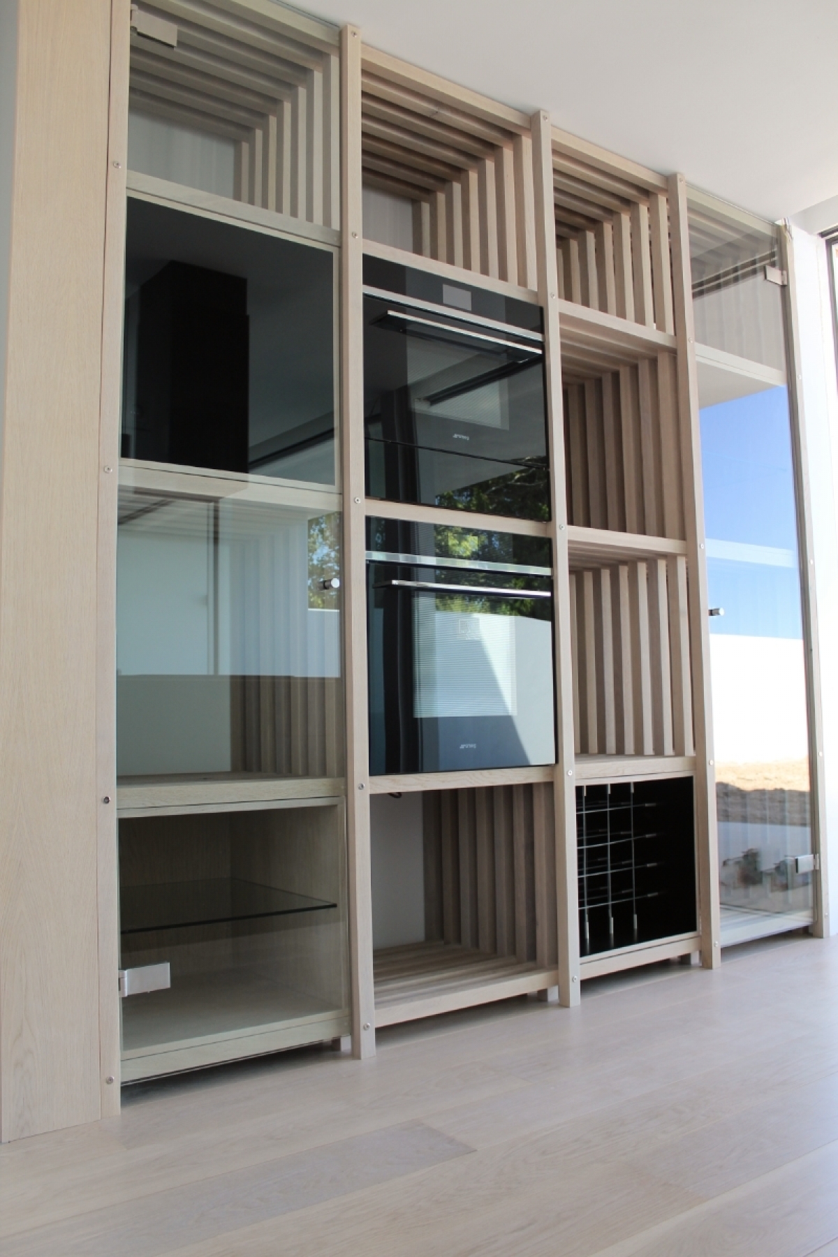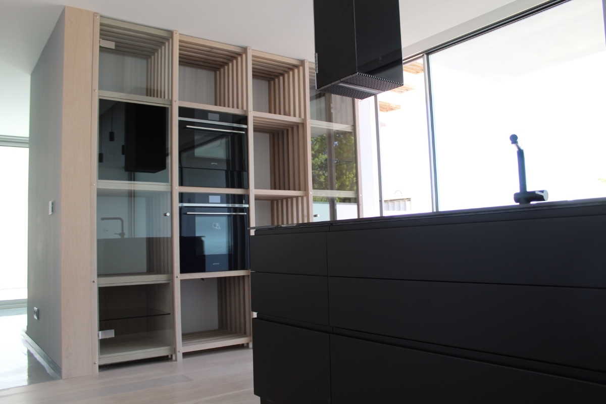 Bois de chêne "Cruzado", verre trempé 8 mm, mdf laqué noir texturé et plateaux Dekton Domoos