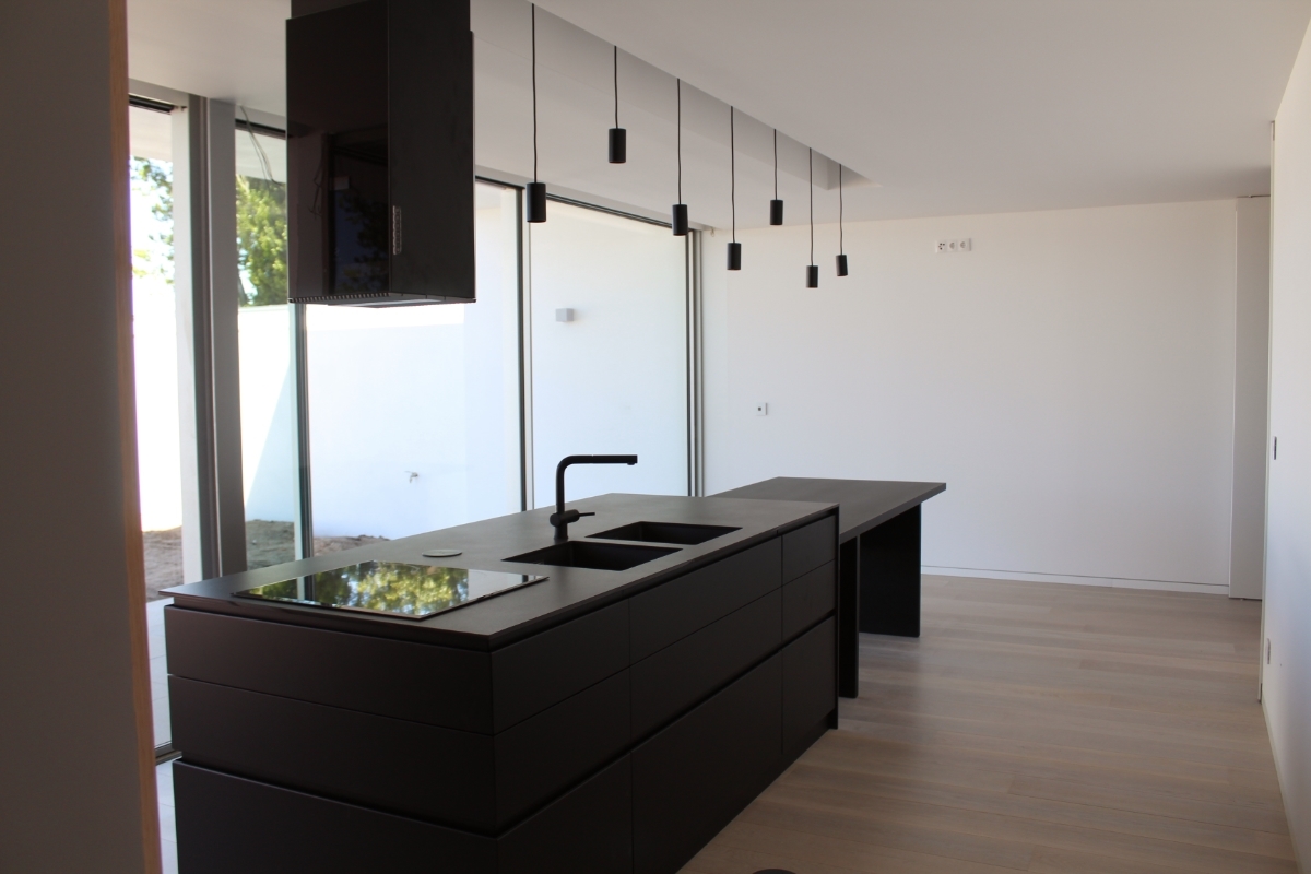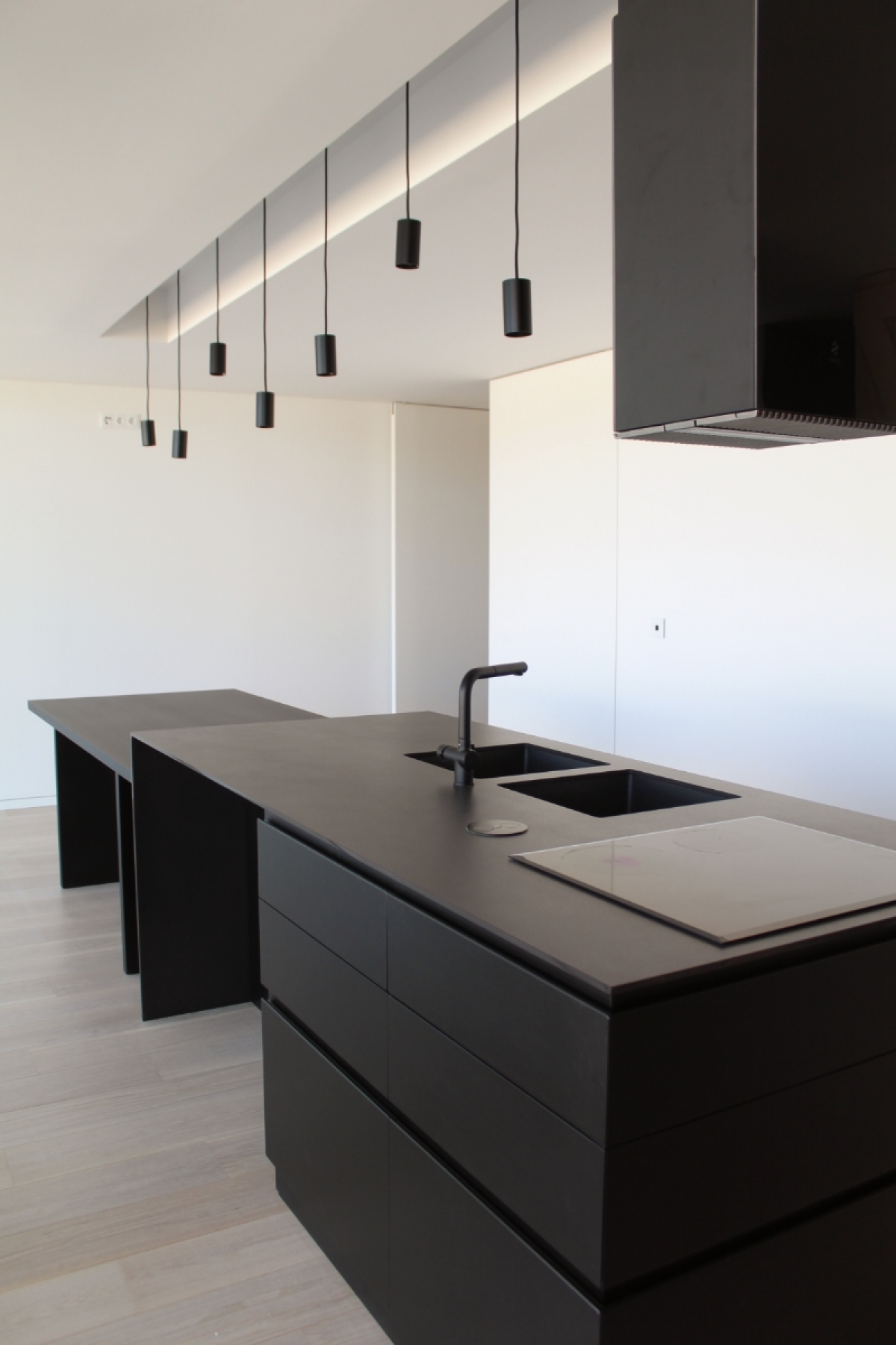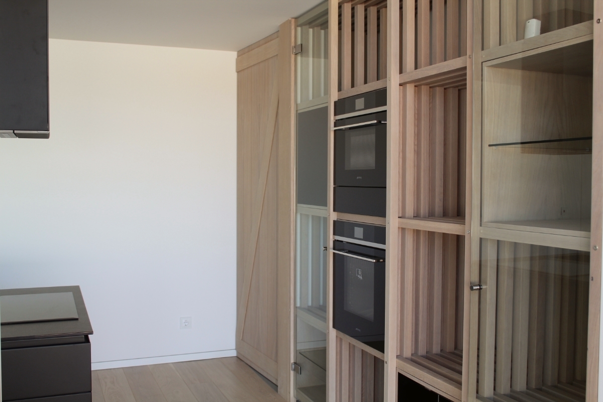 Bois de chêne "Cruzado", verre trempé 8 mm, mdf laqué noir texturé et plateaux Dekton Domoos