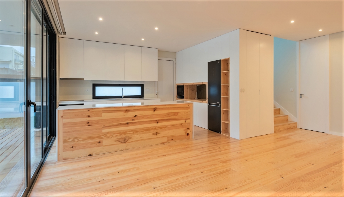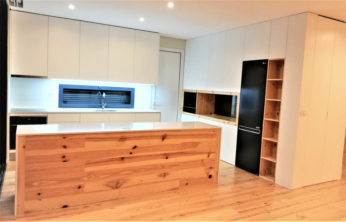 Lacado branco mate com elementos em Pinho rústico e tampos em Silestone branco Zeus.