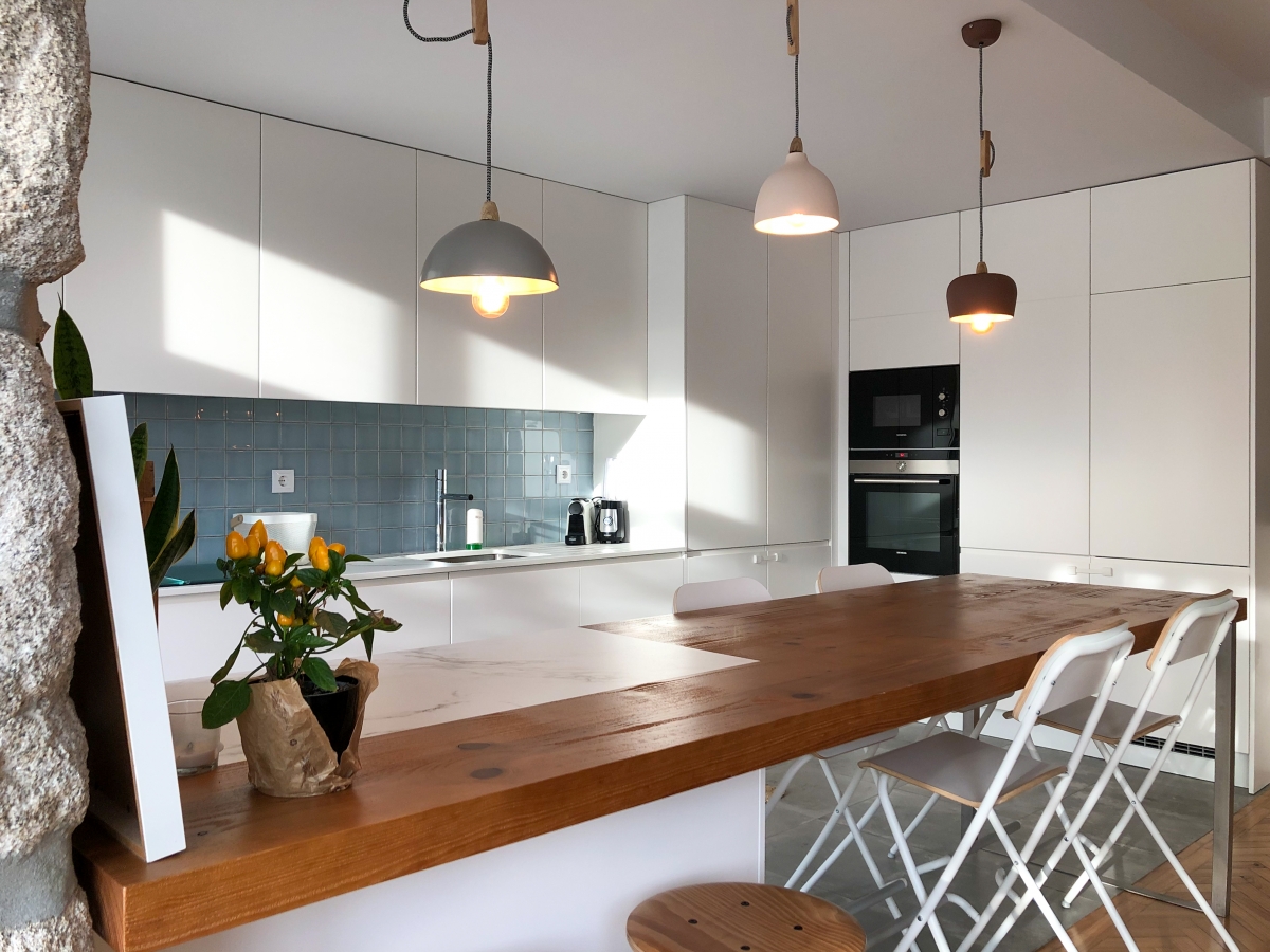 Cozinha com frentes em Mdf lacado branco mate e tampo em madeira de Pinho velho texturada e Dekton Entzo