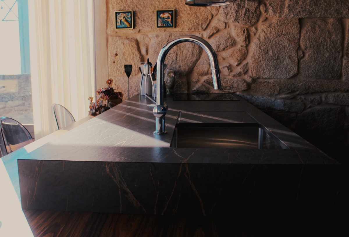 Mdf lacado a Cinza com elementos em Folheado de Ébano e tampos em Dekton Laurent